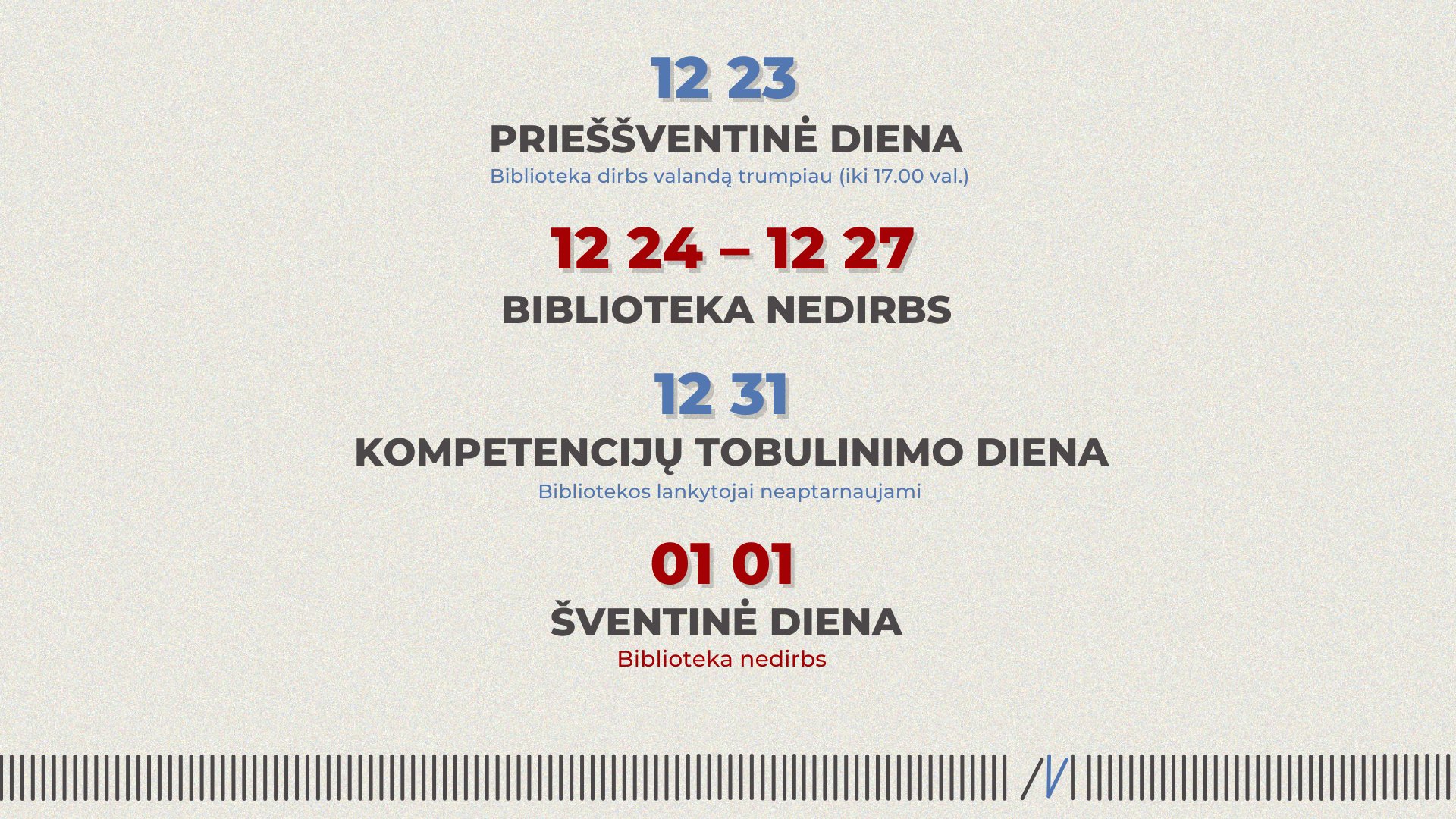 Informuojame apie bibliotekos darbo laiką gruodžio 23–31 d.