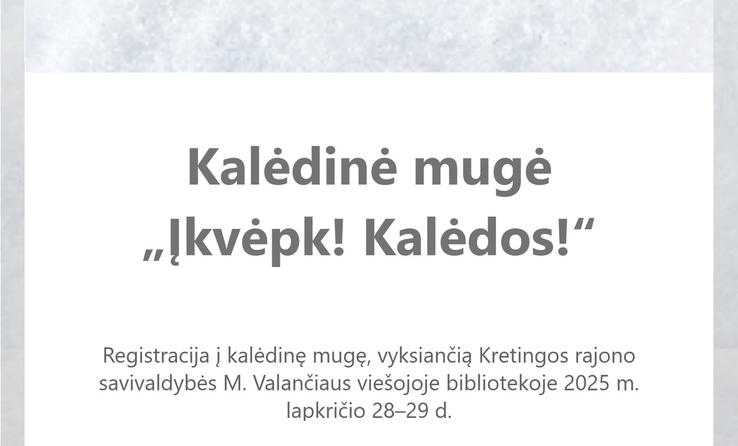 Mugė vyks 2025 m. lapkričio 28–29 d. J. K. Chodkevičiaus g. 1 B, Kretingos rajono savivaldybės M. Valančiaus viešojoje bibliotekoje.