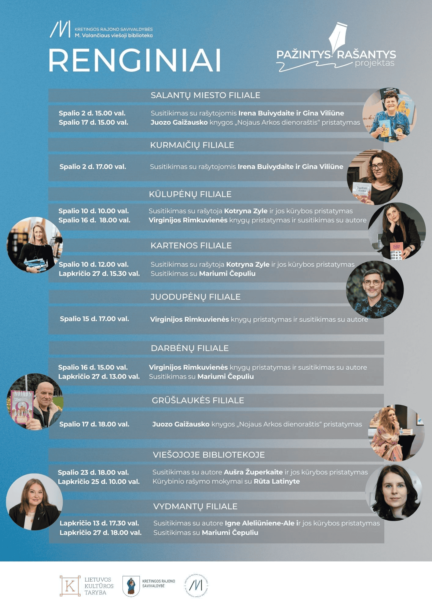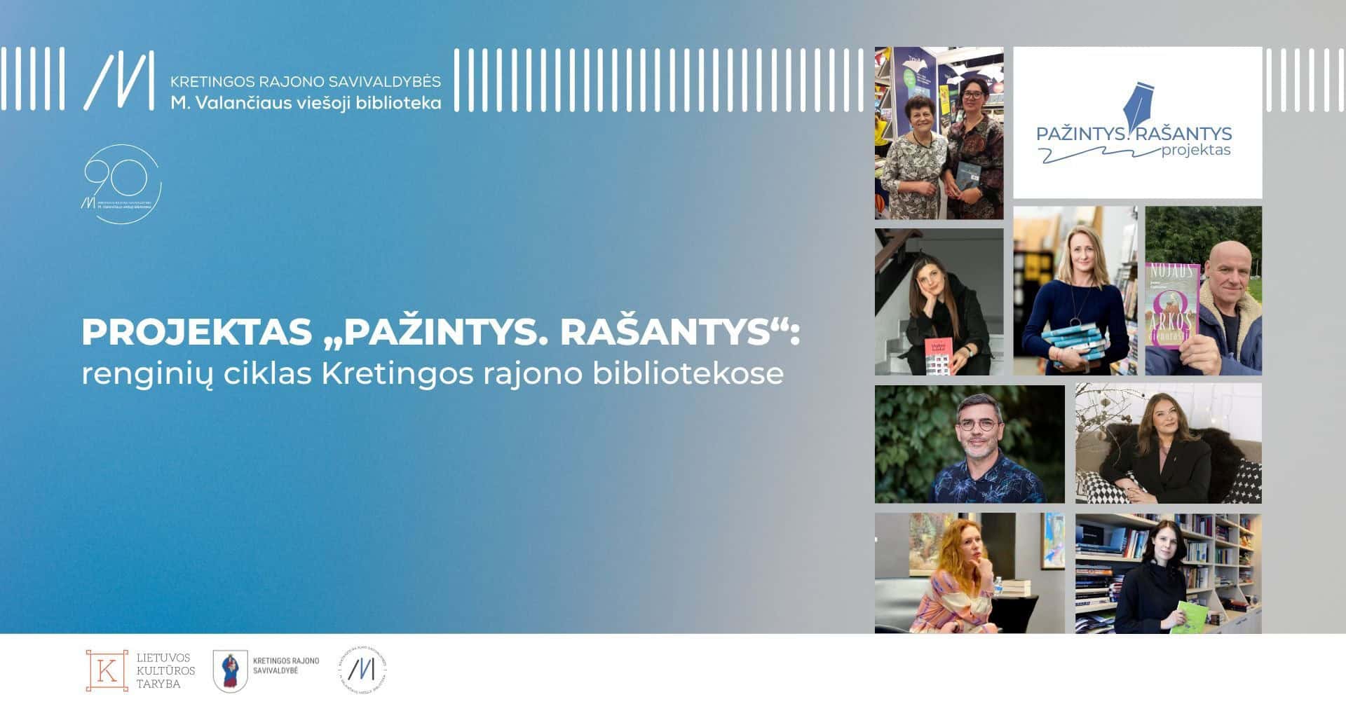 Kretingos rajono savivaldybės M. Valančiaus viešoji biblioteka kartu su partneriais pradeda įgyvendinti naują Lietuvos kultūros tarybos ir Kretingos rajono savivaldybės finansuojamą projektą „Pažintys. Rašantys“. Šio projekto tikslas – priartinti aktualiąją Lietuvos literatūrą prie rajono gyventojų, sudaryti sąlygas susitikti su žymiais kūrėjais ir išgirsti jų kūrybos istorijas iš pirmų lūpų.