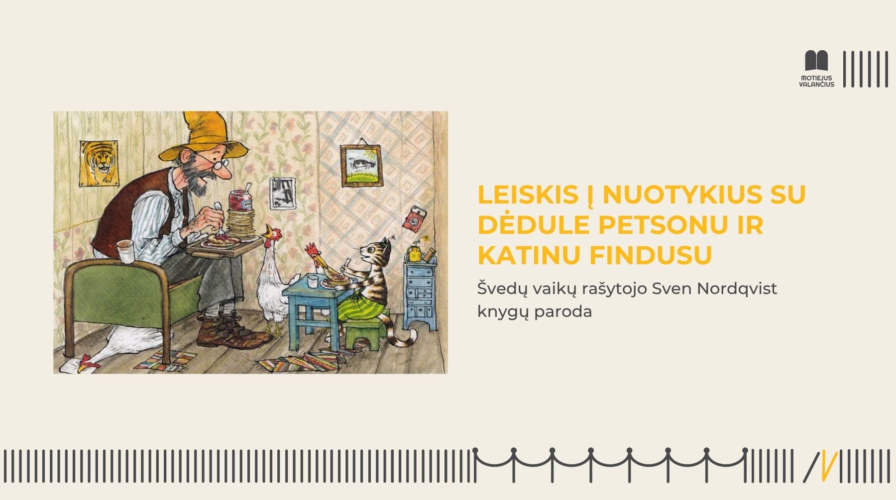 Švedų vaikų rašytojas Sven Nordqvist kviečia vaikus pasinerti į dėdulės Petsono ir katino Finduso nuotykius knygų parodoje „Leiskis į nuotykius su dėdule Petsonu ir katinu Findusu“. Petsonas su Findusu patiria daugybę juokingų, bet kartu ir mielų nutikimų, o knygų iliustracijos yra šmaikščios, lavinančios vaizduotę, kviečiančios tyrinėti.