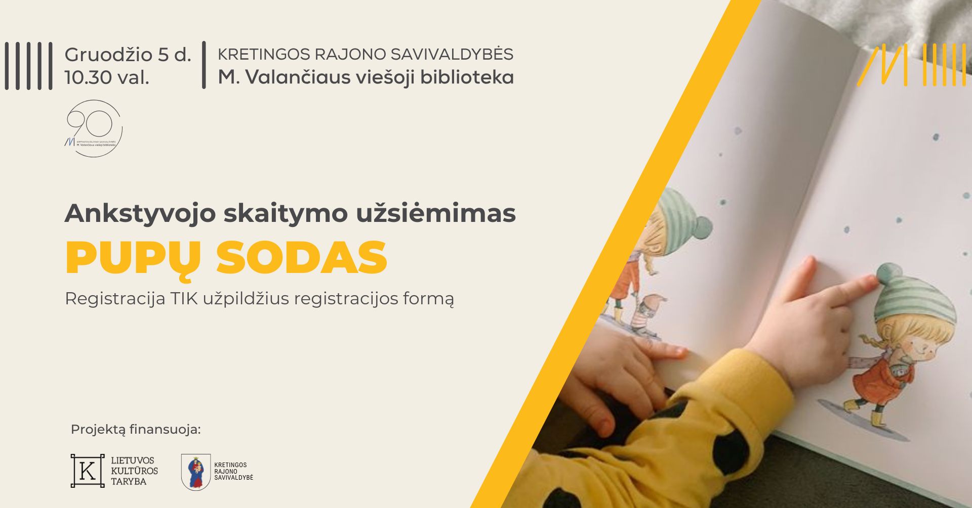 Ankstyvojo skaitymo užsiėmimas „Pupų sodas“ kviečia 1–2 metų vaikus patirti pasaką per įvairius pojūčius: pamatyti, išgirsti, užuosti, paliesti. Žaisdami patirsime smagių nuotykių ir auginsime draugystę su knyga.