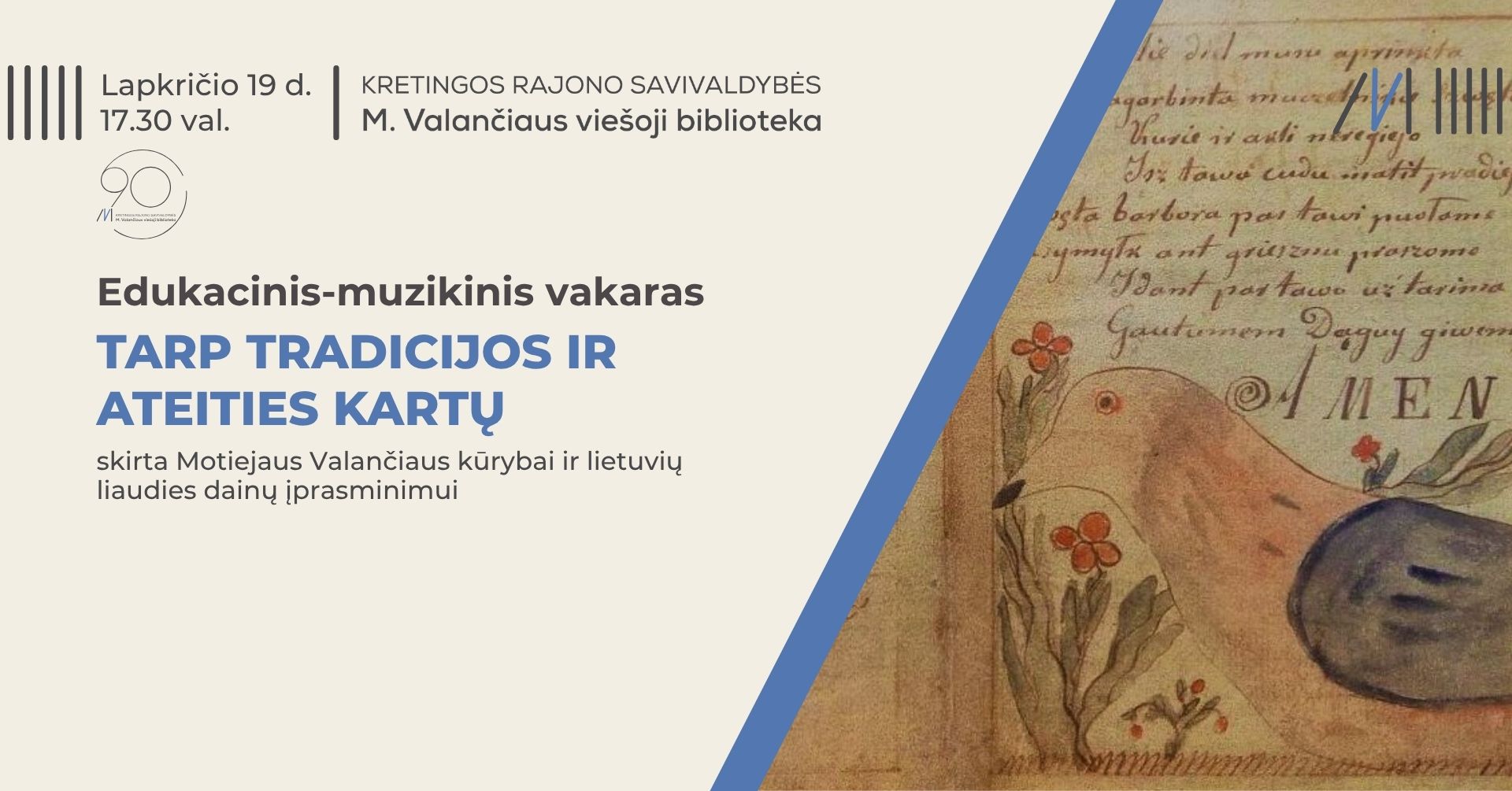 Kretingos biblioteka kviečia į edukacinį-muzikinį renginį „Tarp tradicijos ir ateities kartų“, kuriuo siekiama gyvai ir prasmingai aktualizuoti Motiejaus Kazimiero Valančiaus kūrinį „Palangos Juzė“ bei paminėti Lietuvių liaudies dainų metus.