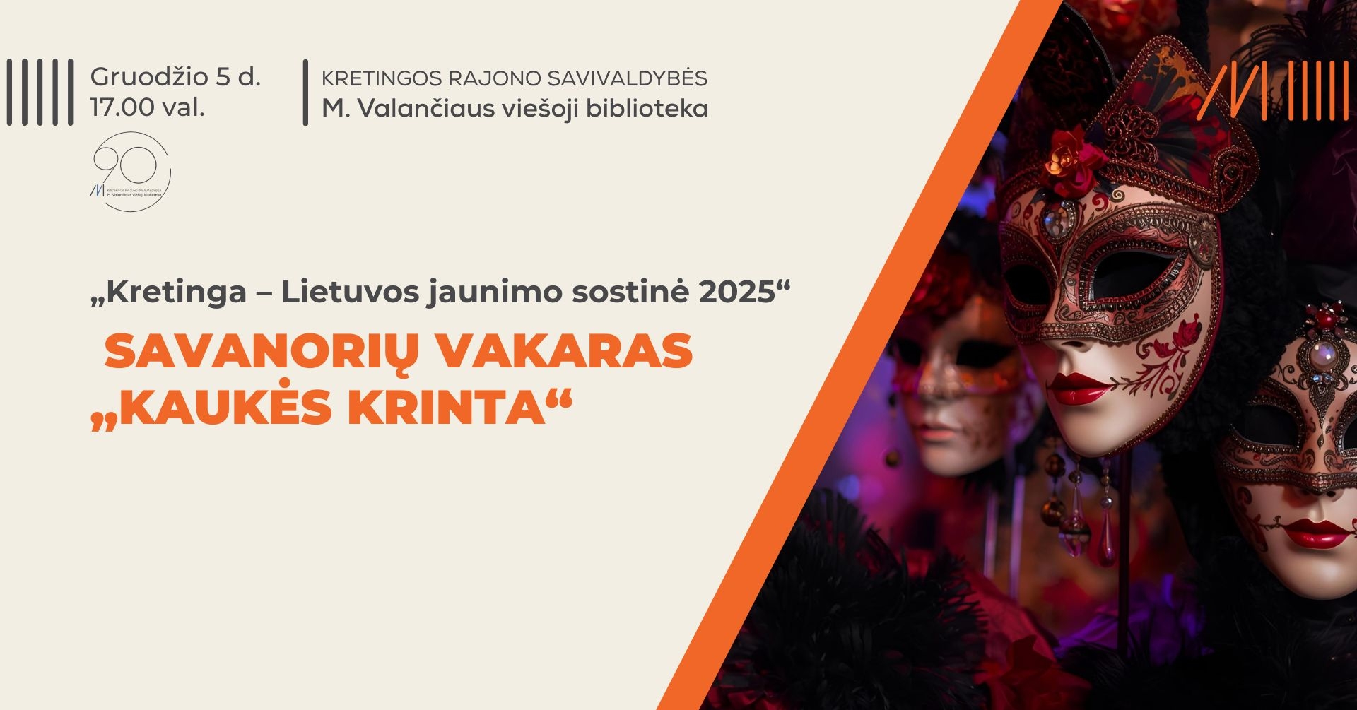 Vakaras „Kaukės krinta“ kviečia „Kretinga – Lietuvos jaunimo sostinė 2025“ savanorius – tuos, kurie visus metus kūrė idėjas, telkė bendruomenę ir savo energija prisidėjo prie jaunimo sostinės gyvybingumo.