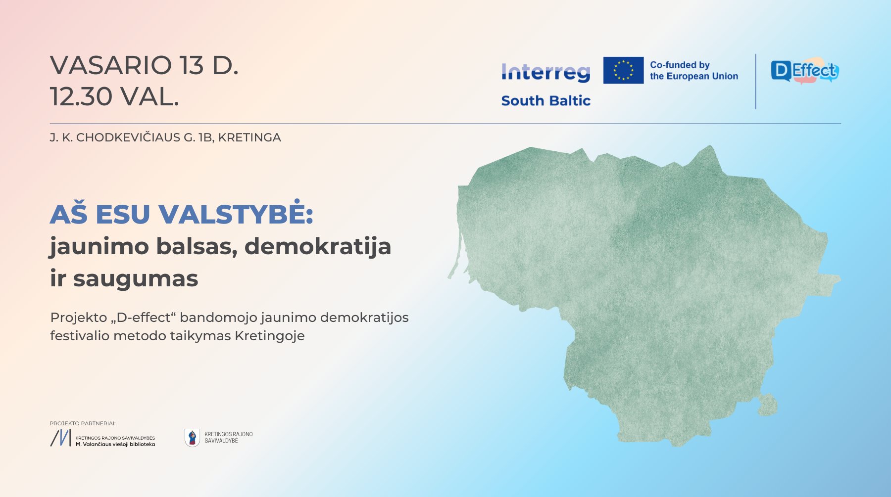 Kviečiame jaunimą į projekto „D-EFFECT“ renginį „Aš esu Valstybė: jaunimo balsas, demokratija ir saugumas“: bandomojo jaunimo demokratijos festivalio metodo taikymas Kretingoje.