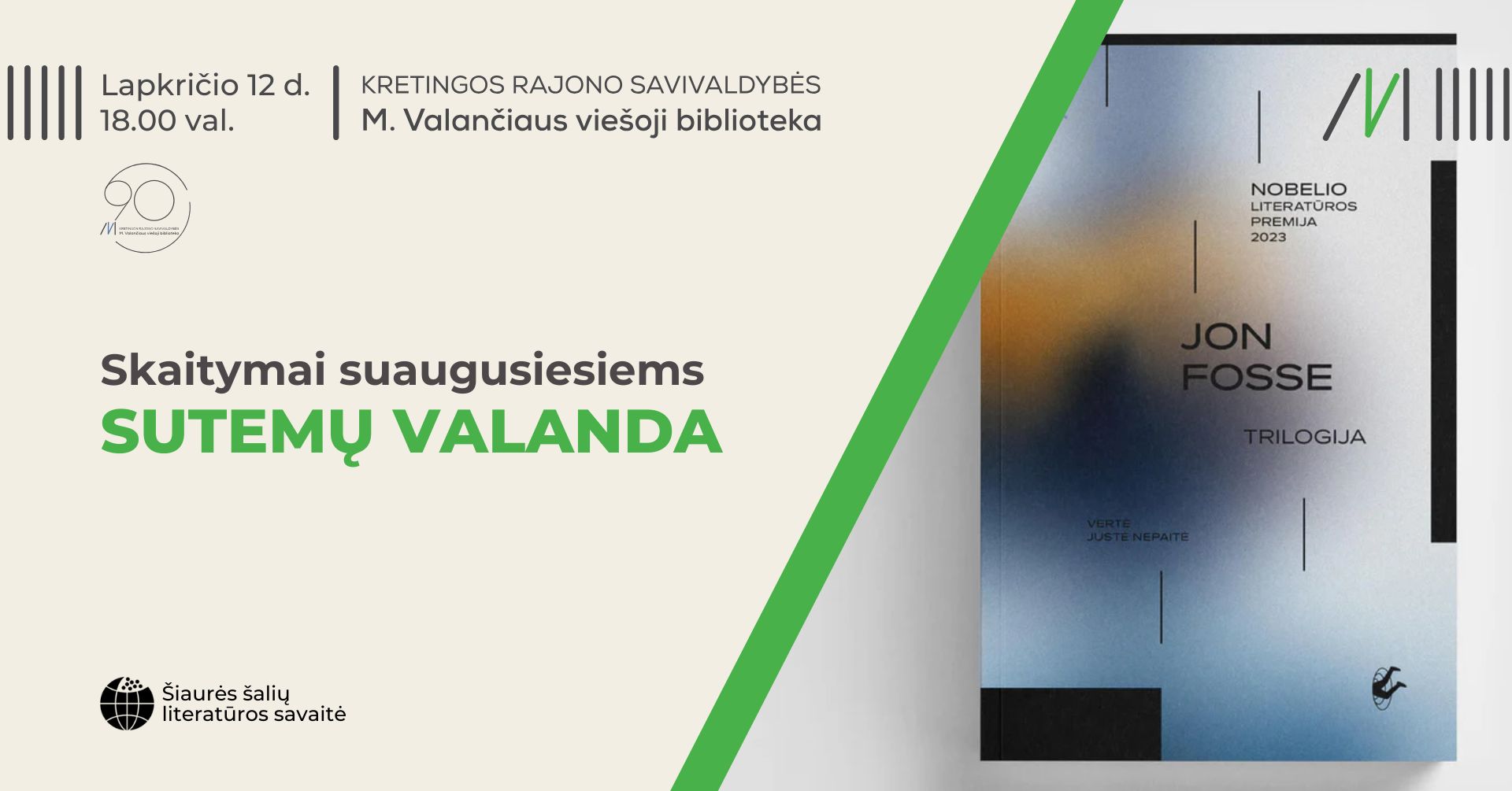 Minėdami Šiaurės šalių literatūros savaitę kviečiame į skaitymus suaugusiesiems „Sutemų valanda“ Kretingos bibliotekoje. Jaukioje prieblandoje bus garsiai skaitomos ištraukos iš norvegų rašytojo, Nobelio literatūros premijos laureato Jon Fosse knygos „Nakvišų klajonės“. Tai lėtas, poetiškas pasakojimas apie klajones, tylą, žmogaus vidinį pasaulį ir buvimo prasmę – tarsi meditacija žodžiais, puikiai deranti prie sutemų nuotaikos.