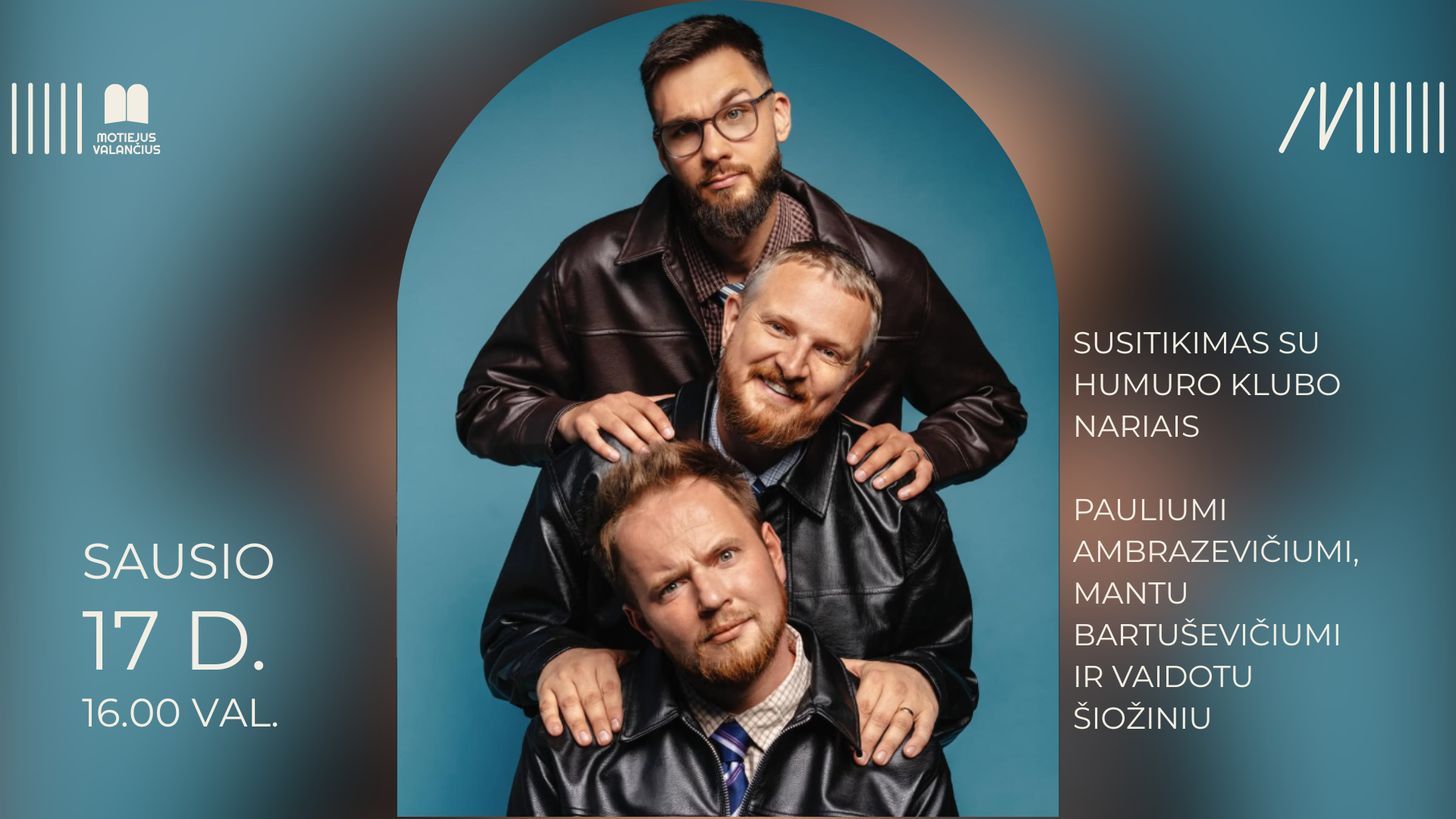 Kviečiame į atvirą, gyvą ir humoro kupiną susitikimą su „Humoro klubo“ nariais Pauliumi Ambrazevičiumi, Mantu Bartuševičiumi ir Vaidotu Šiožiniu.