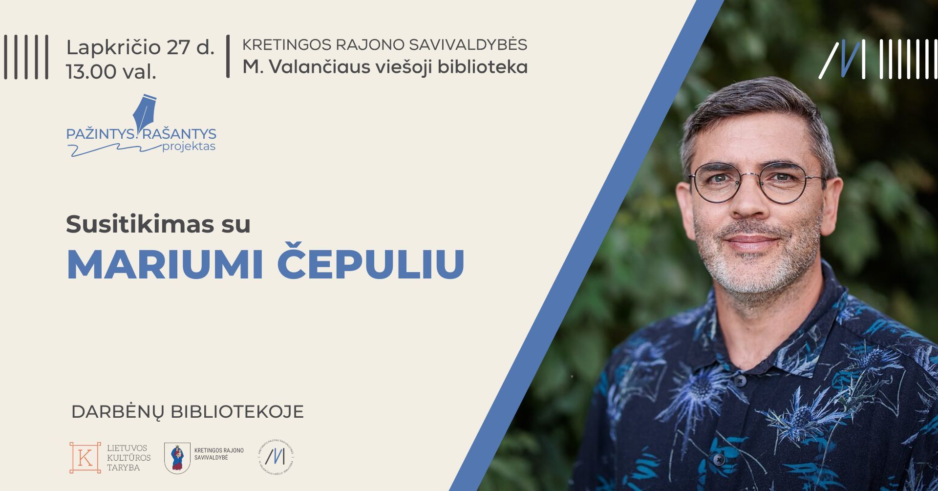 Kviečiame į gyvą susitikimą su Mariumi Čepuliu, kurį organizuoja Kretingos rajono savivaldybės M. Valančiaus viešosios bibliotekos Darbėnų filialas. Renginys vyks Darbėnų gimnazijos salėje (Laukžemės g. 9, Darbėnai).