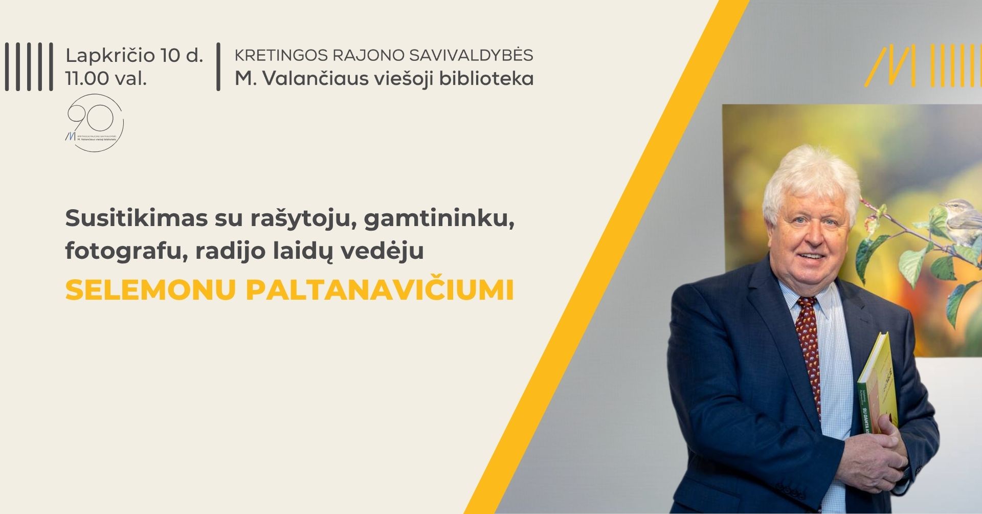 Kretingos bibliotekoje vaikus pasitiks ypatingas svečias Selemonas Paltanavičius – rašytojas, gamtininkas, fotografas ir radijo laidų vedėjas – žmogus, kuris gamtą moka ne tik pažinti, bet ir apie ją pasakoti taip, kad sužavėtų tiek mažus, tiek didelius klausytojus.