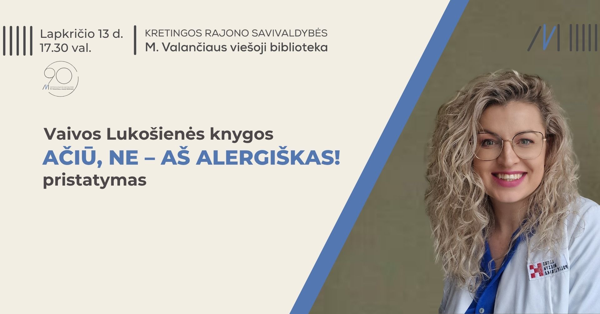 Gyvensenos medicinos specialistė ir knygos „Ačiū, ne – aš alergiškas!“ autorė Vaiva Lukošienė kviečia į susitikimą ir knygos pristatymą Kretingos bibliotekoje.